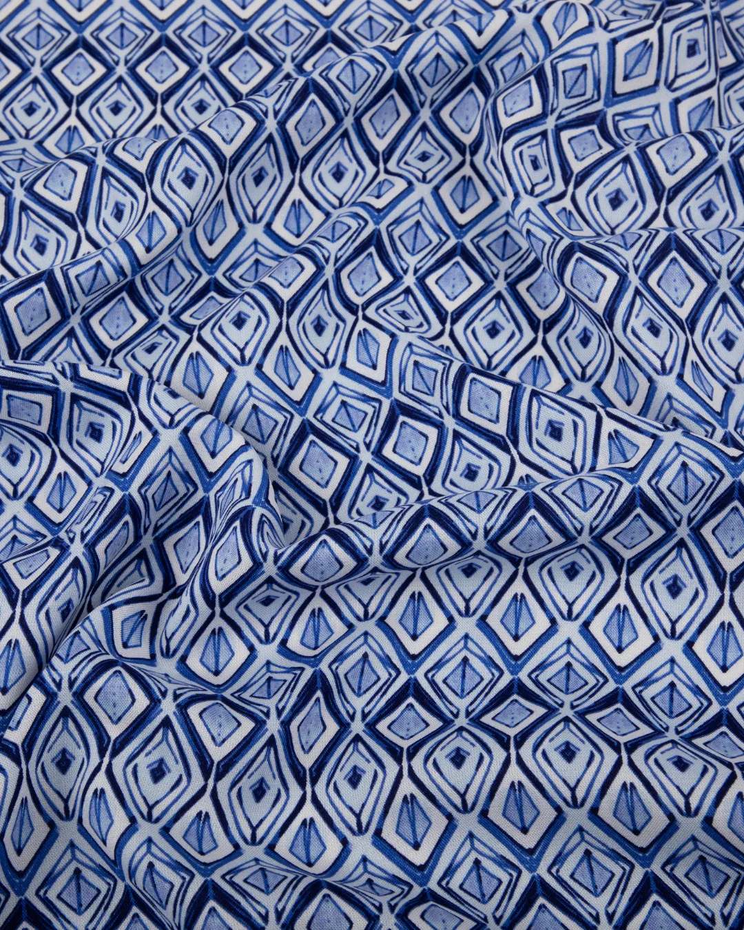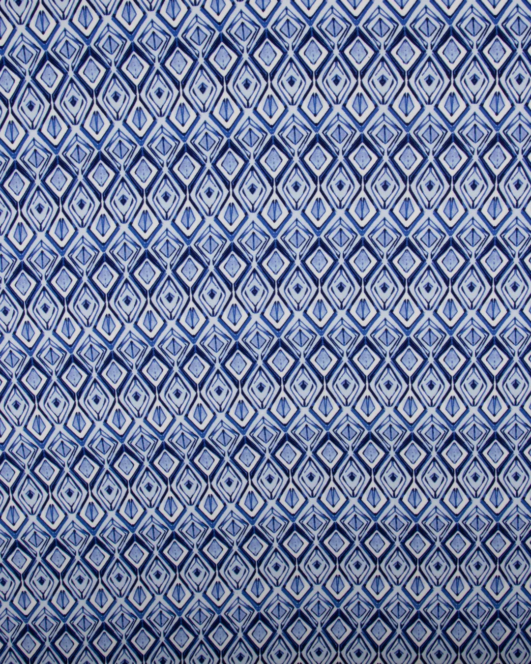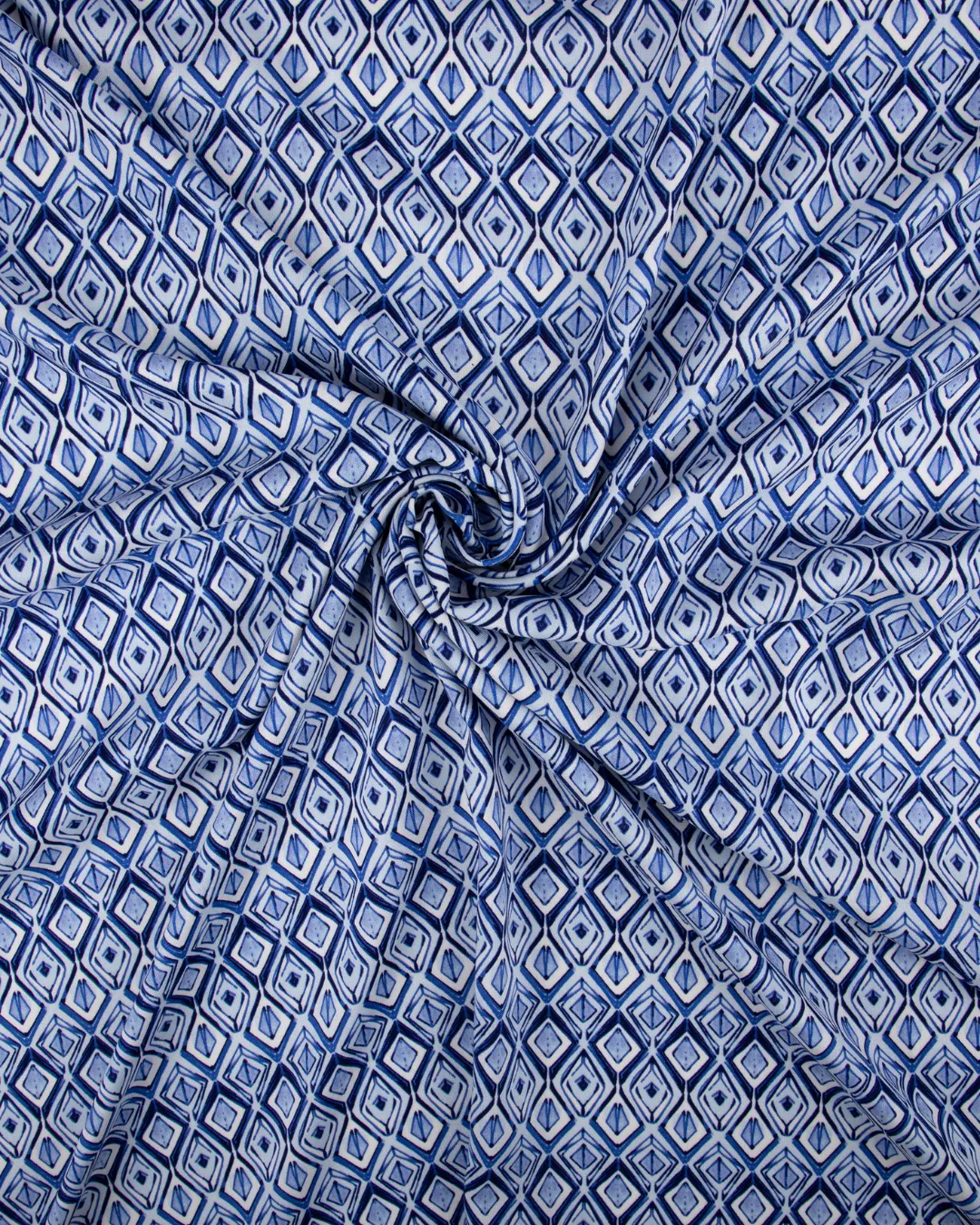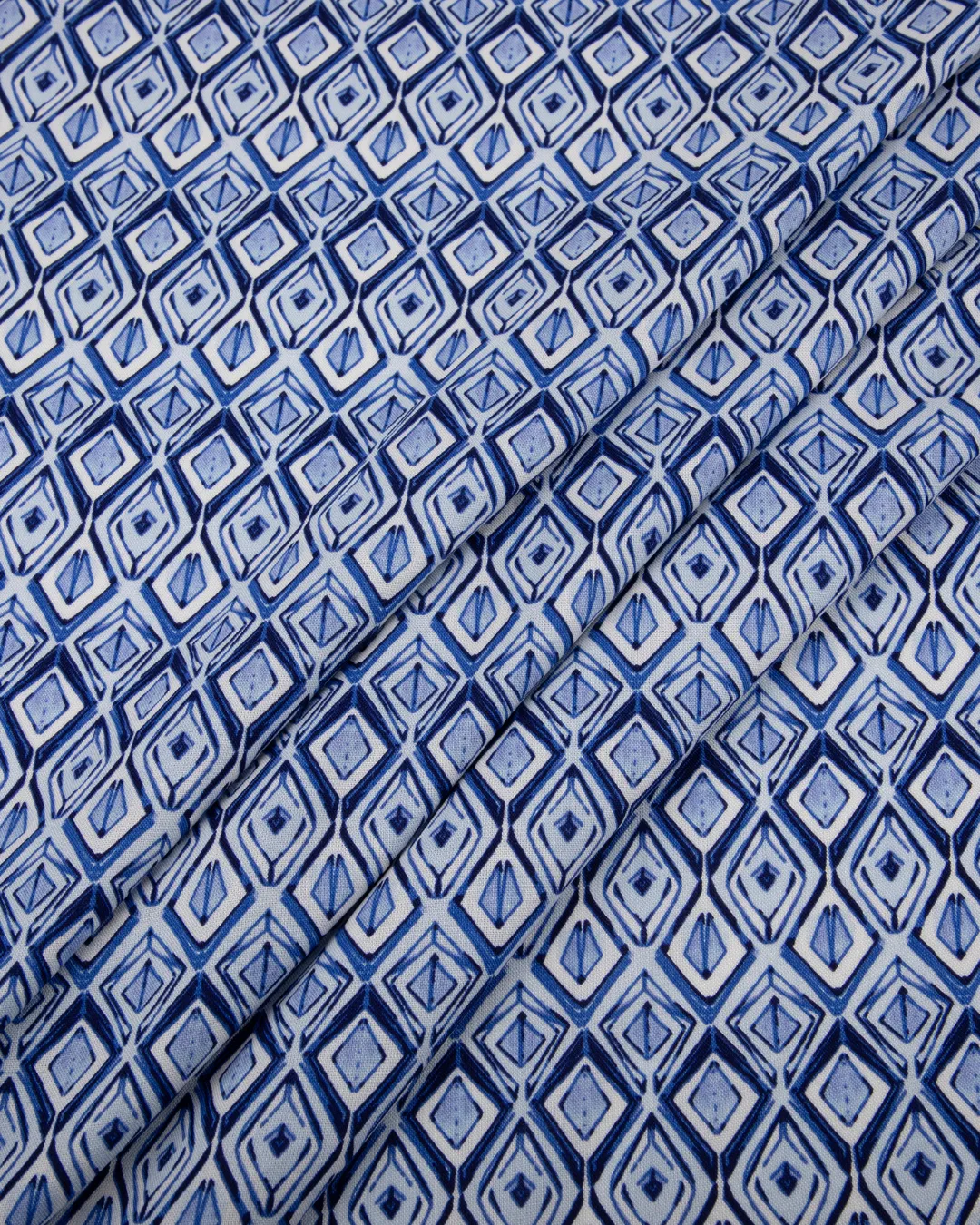 The fabric showcases a striking geometric diamond pattern in layered shades of blue, creating a modern, artistic, and visually appealing look on a clean white background. Its fluid fall and soft finish make it a popular choice for garments that require movement, elegance, and a polished appearance.