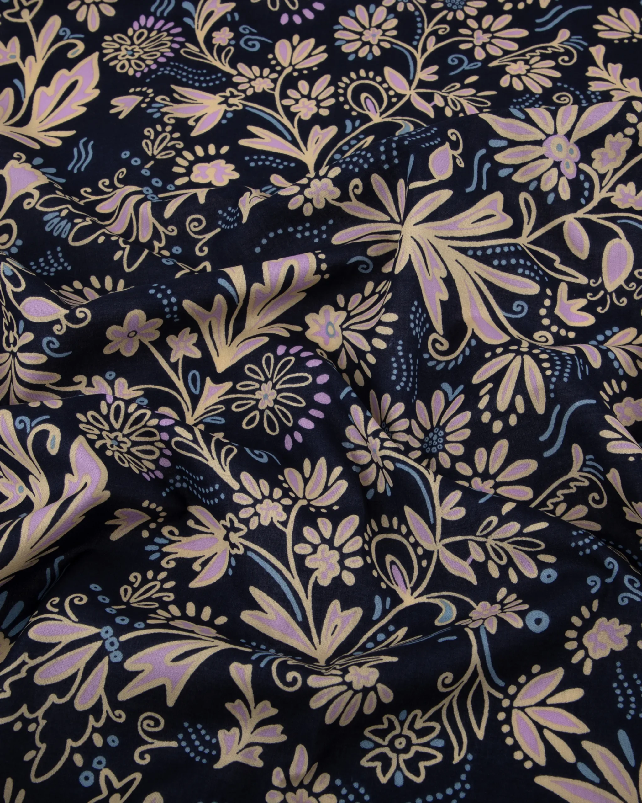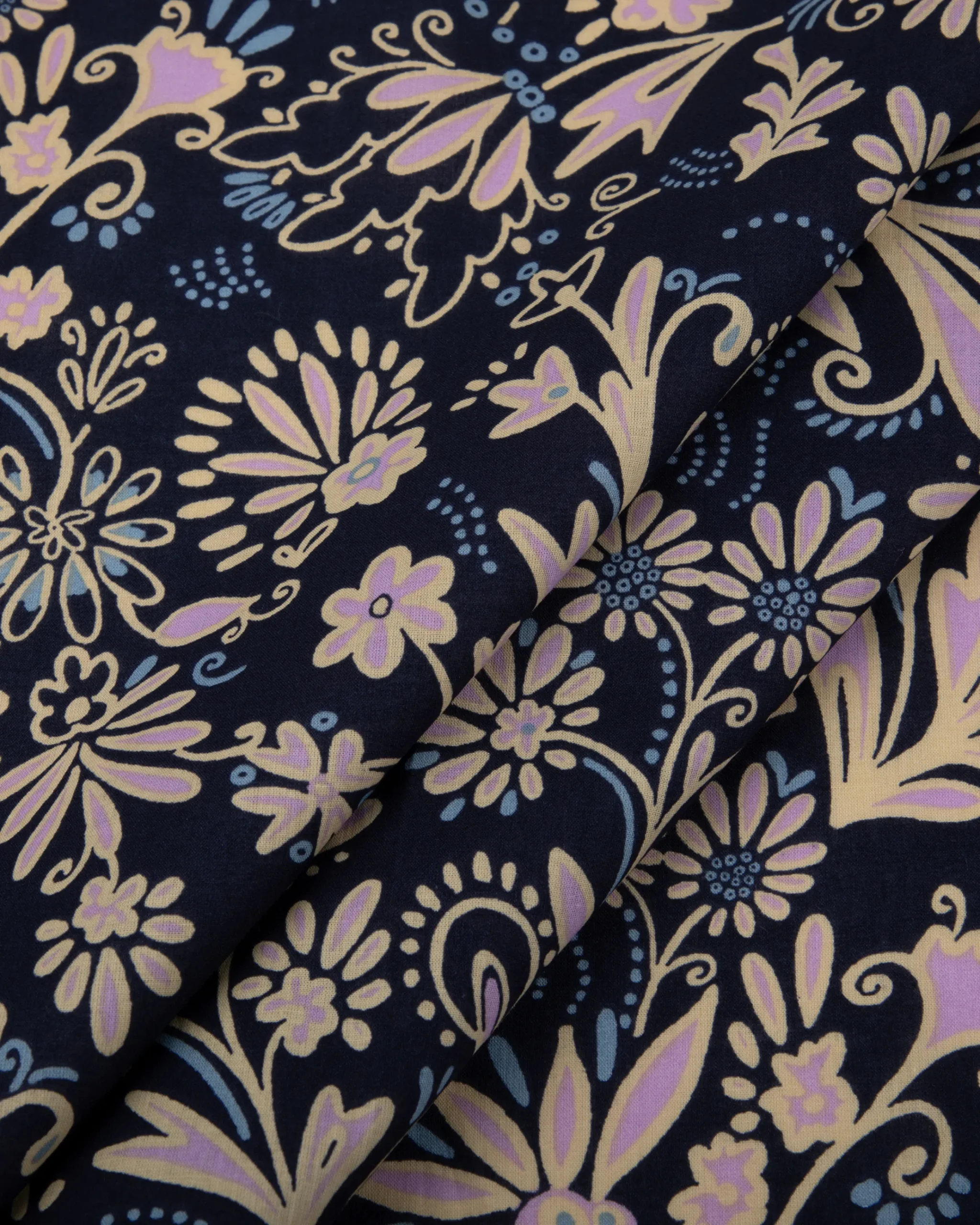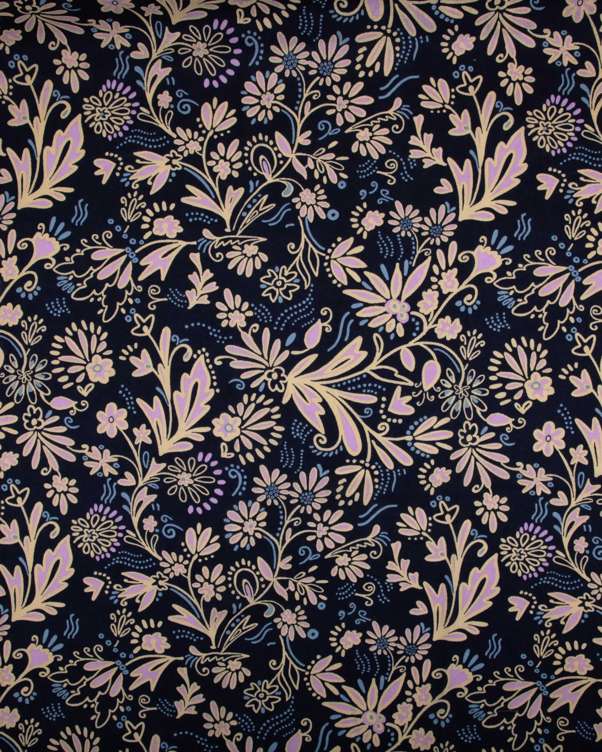 This Printed 60s Cambric features an elegant navy blue base adorned with soft pastel floral vines in lavender, beige, and powder blue.