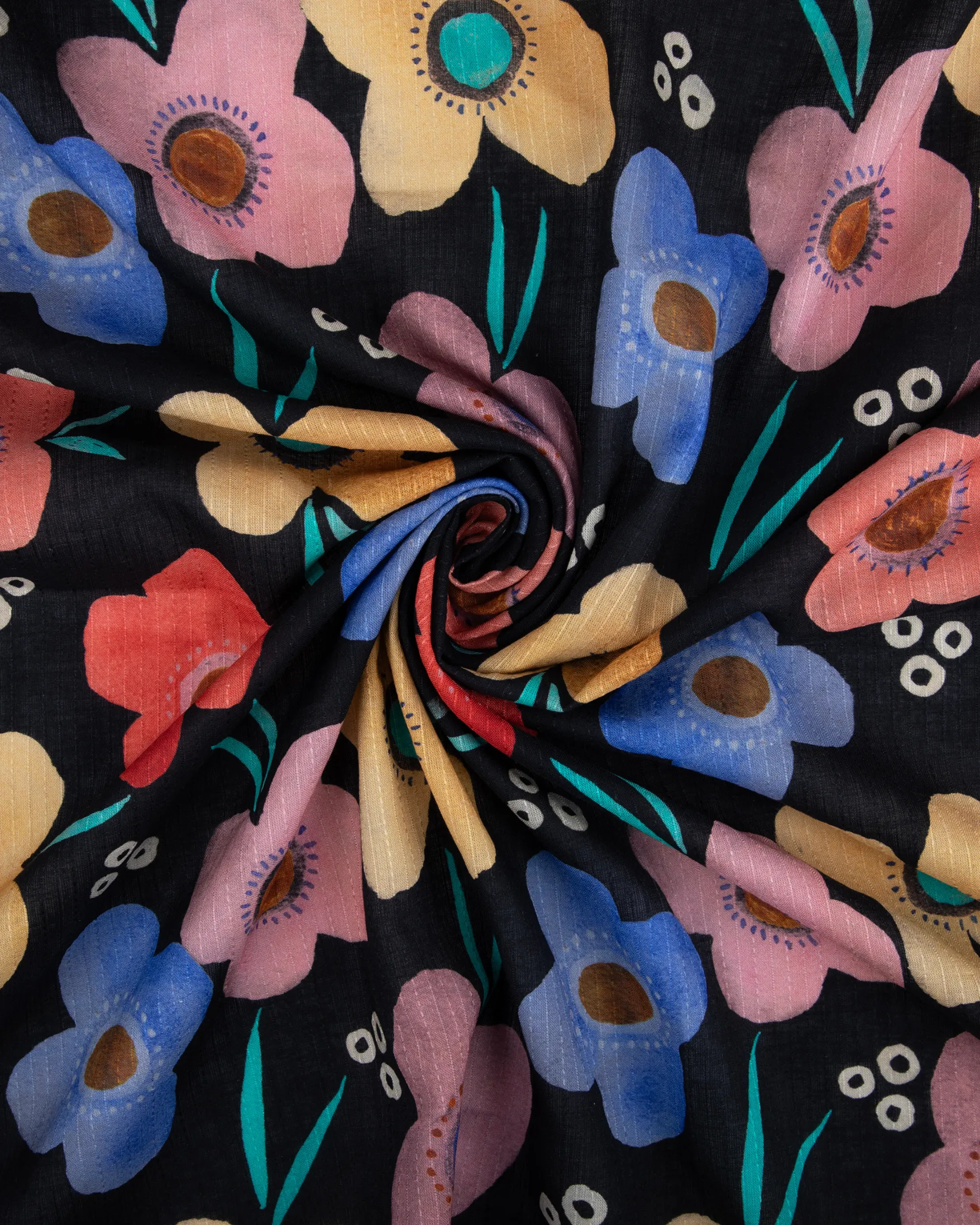 This Printed Cotton Dobby features vibrant, hand-painted style multicolor florals in shades of yellow, red, blue, and blush pink, set beautifully against a deep black base. The playful petals, dotted centers, and lively leaf accents create a striking, artistic look that instantly stands out.