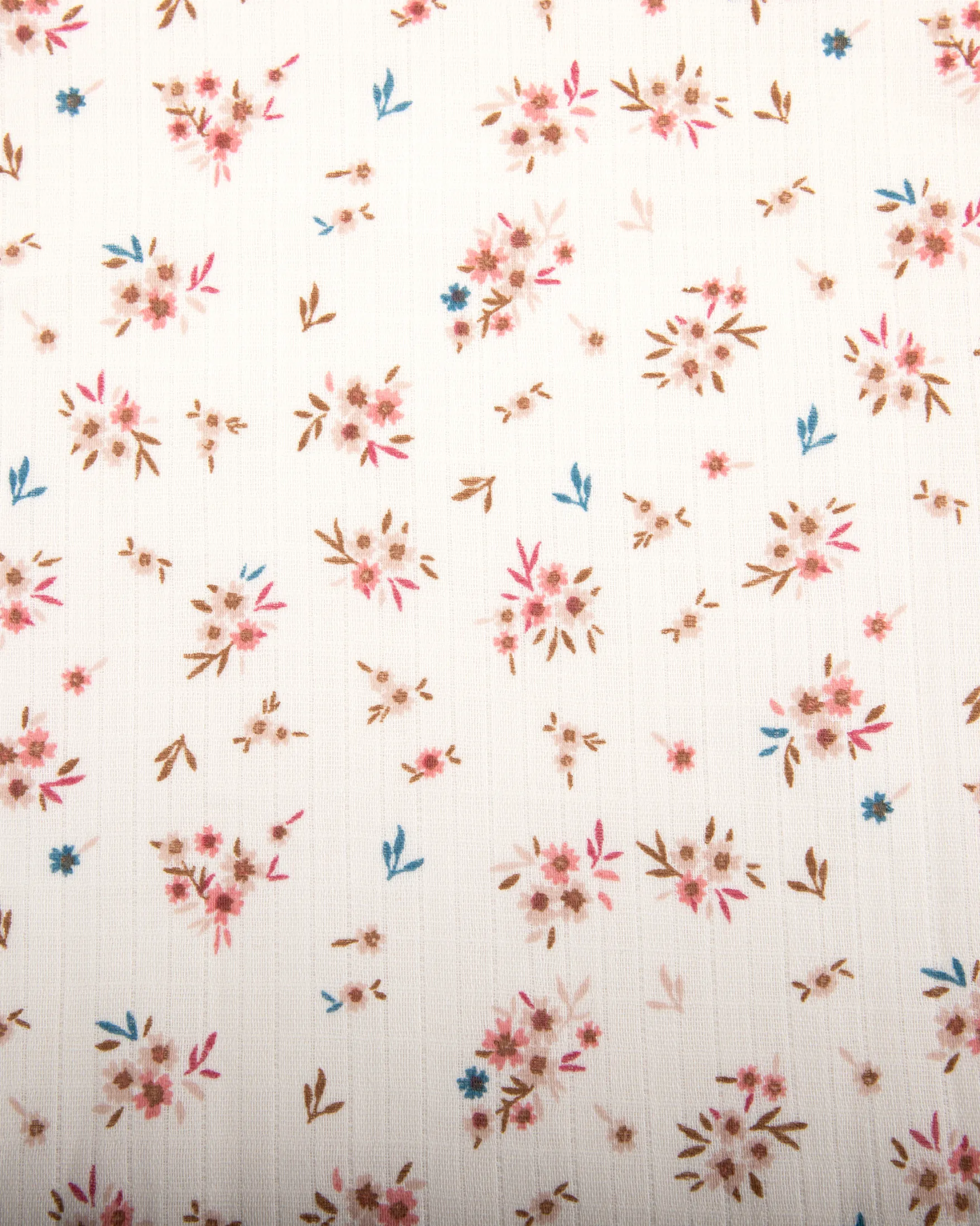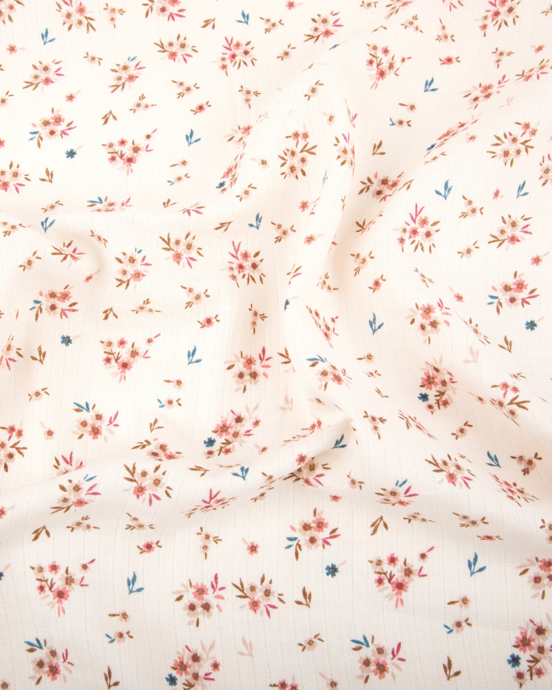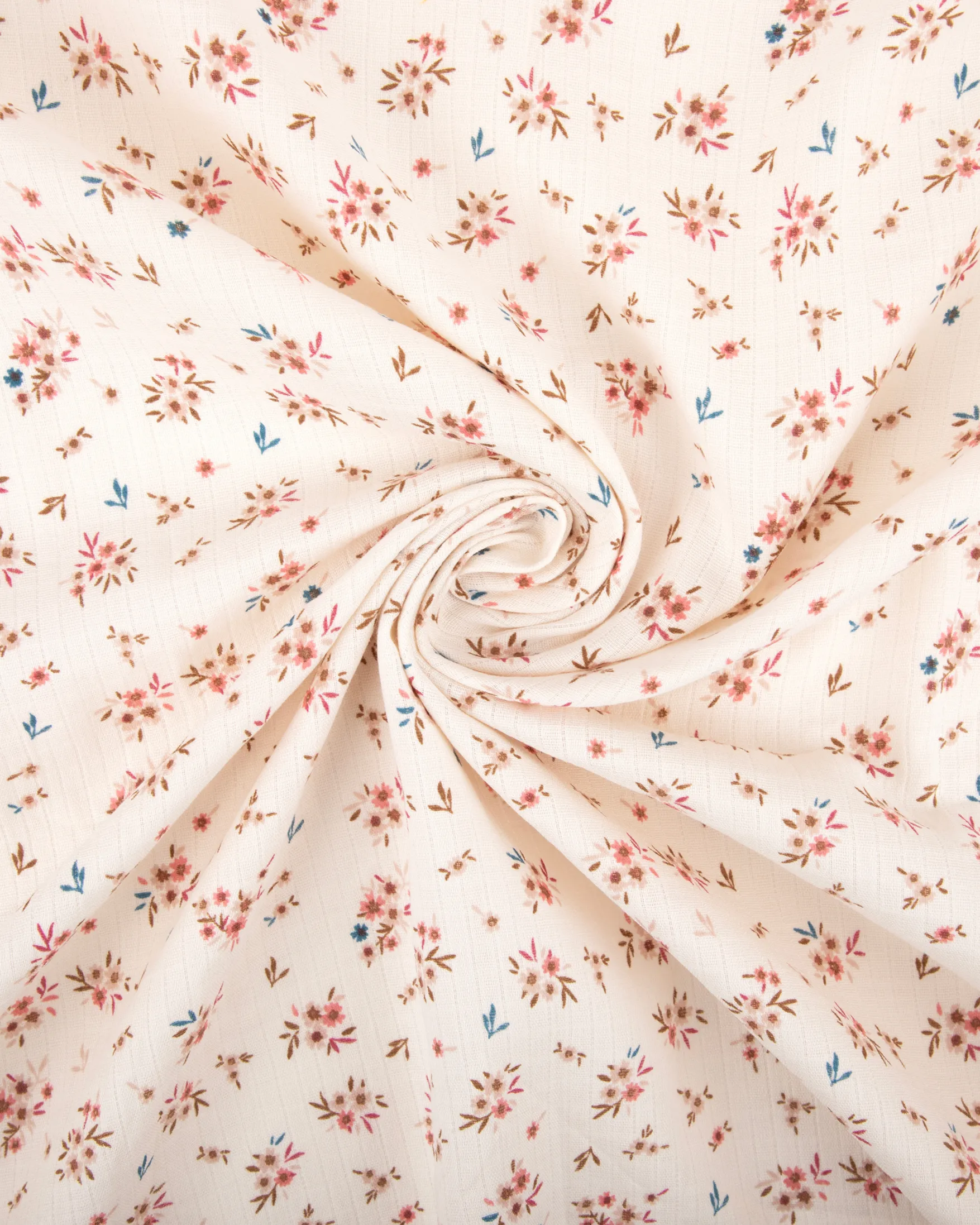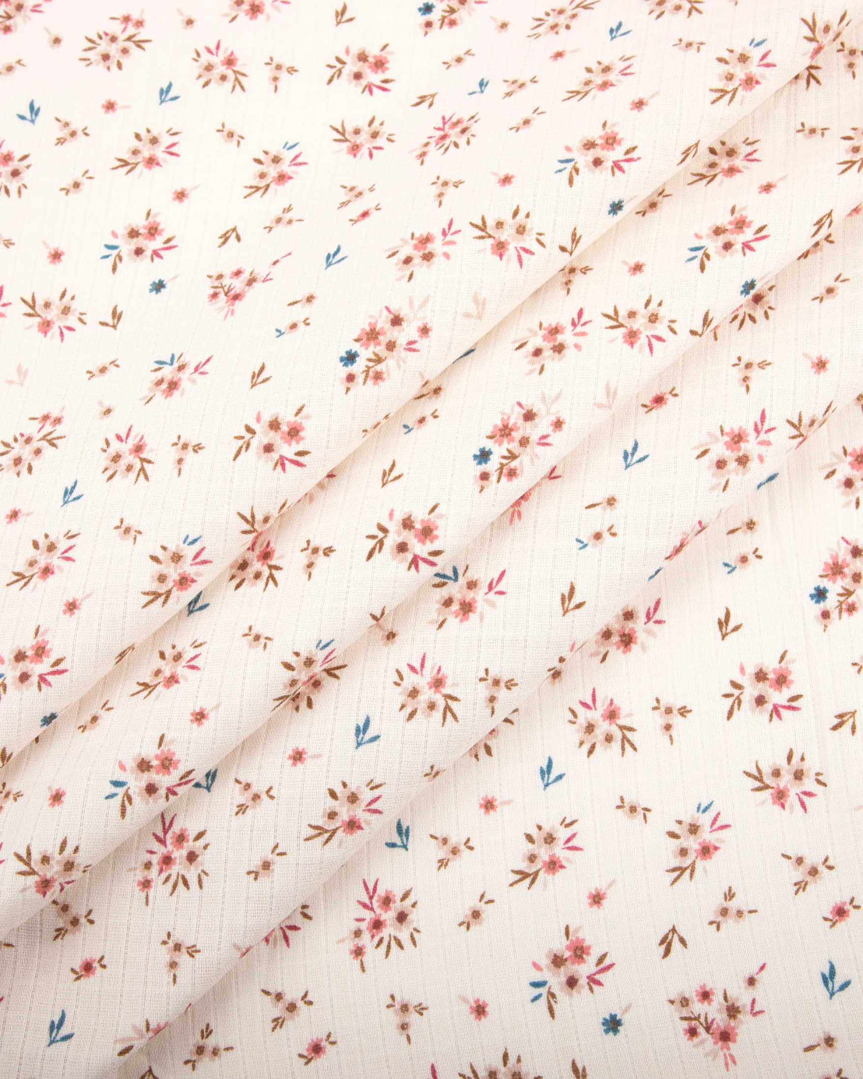 This Printed Cotton Dobby features a soft off-white base sprinkled with tiny pastel florals in shades of pink, brown, and hints of blue. The delicate scattered design creates a graceful, feminine, and soothing aesthetic – perfect for everyday minimal yet elegant outfits.