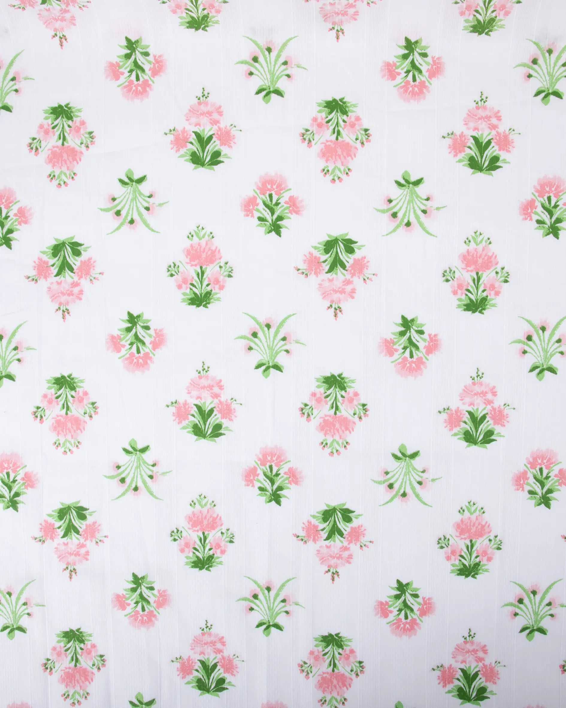 Cotton dobby with pink and green floral boota motifs on a white base. Lightweight, breathable, and ideal for kurtas, dresses, tops, and graceful summer wear.