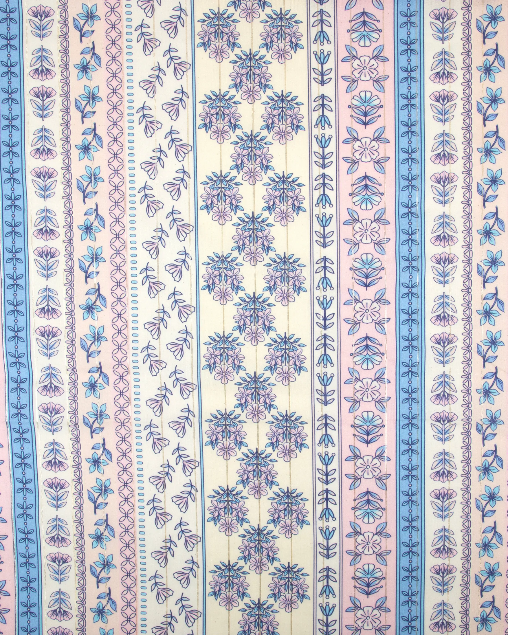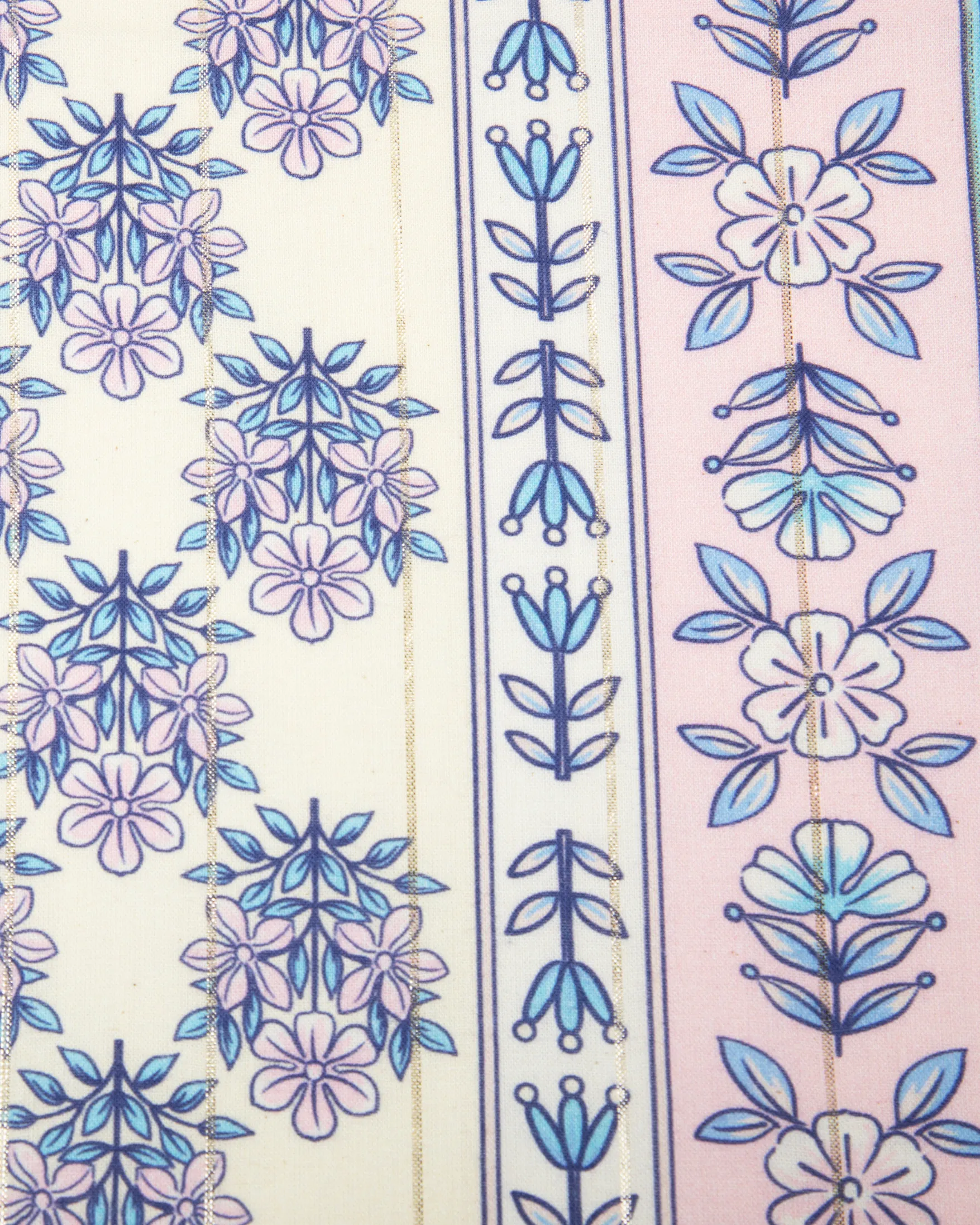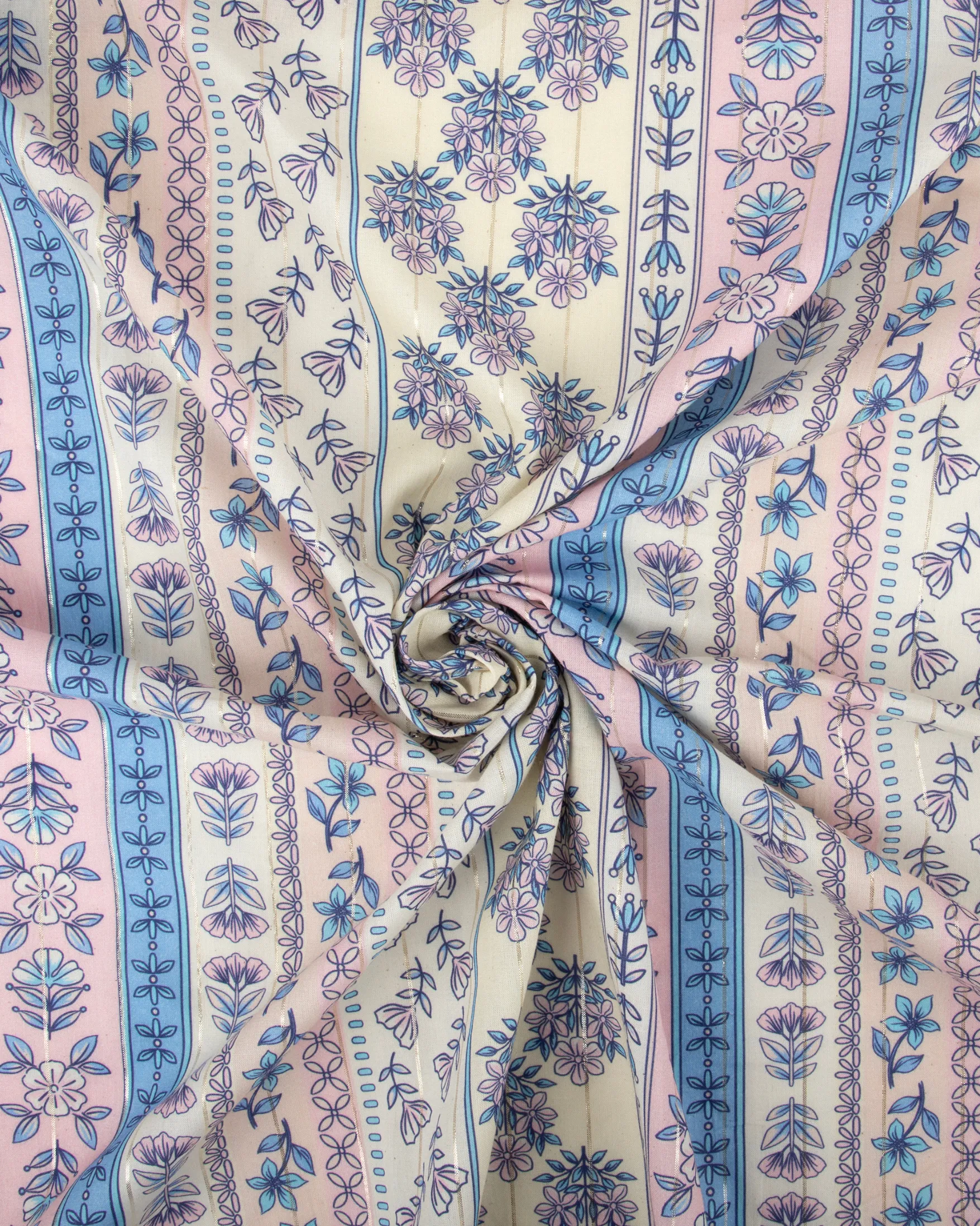 This Printed Cotton Lurex features a charming blend of pastel stripes in pink, cream, and blue, adorned with delicate floral motifs in coordinated shades. Subtle vertical lurex threads add a soft metallic shimmer, giving the fabric a festive yet elegant appeal. The design feels refreshing, feminine, and perfect for both casual and semi-ethnic looks.