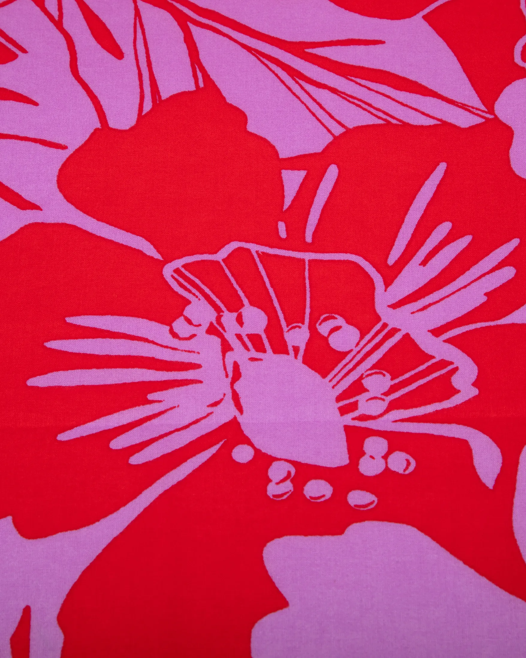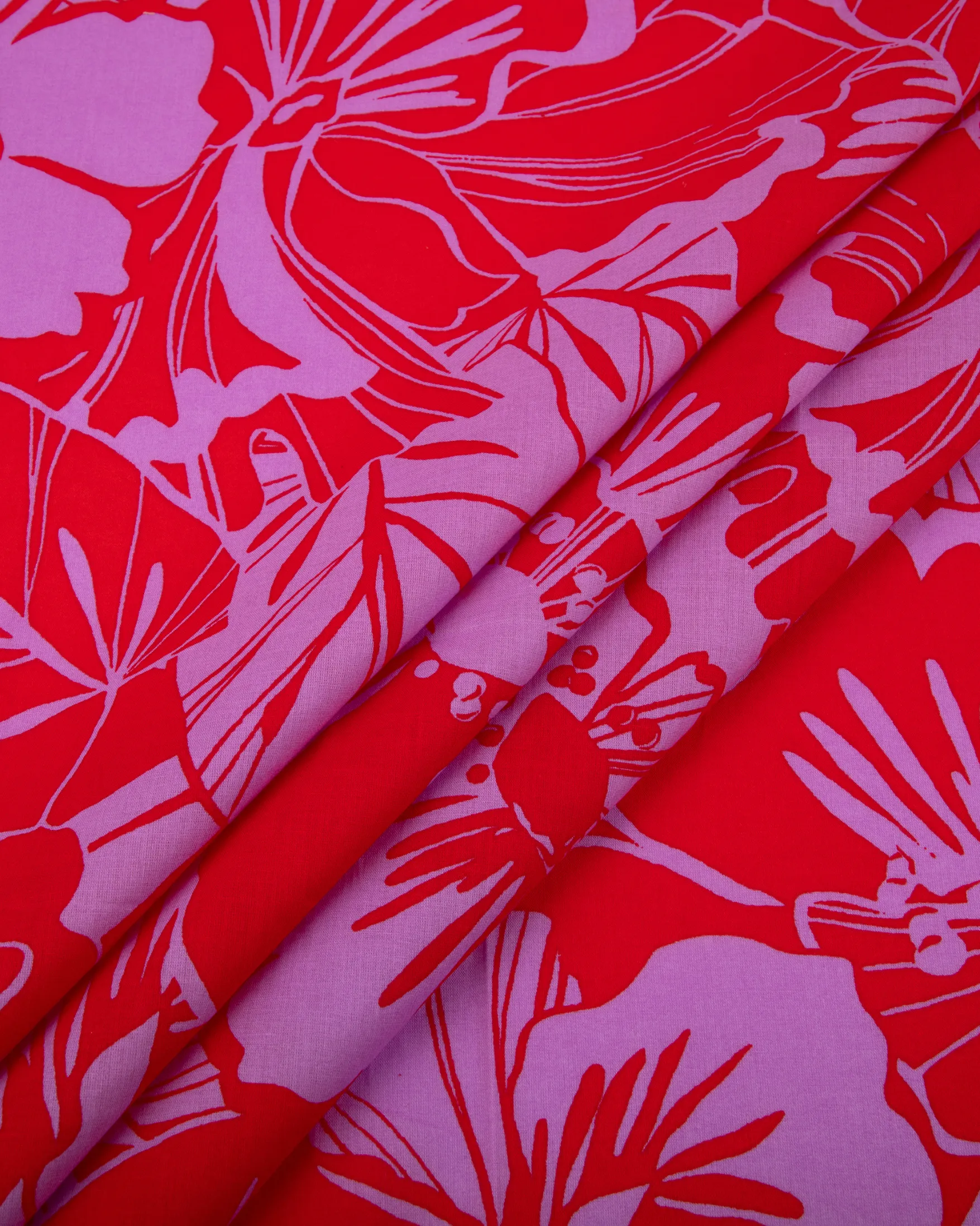 This vibrant Printed Cotton Voil showcases a striking rich red base highlighted with soft lilac oversized floral motifs, creating a bold yet graceful contrast. The artistic floral layout gives this fabric a fresh, contemporary appeal while retaining a soft, feminine charm.
