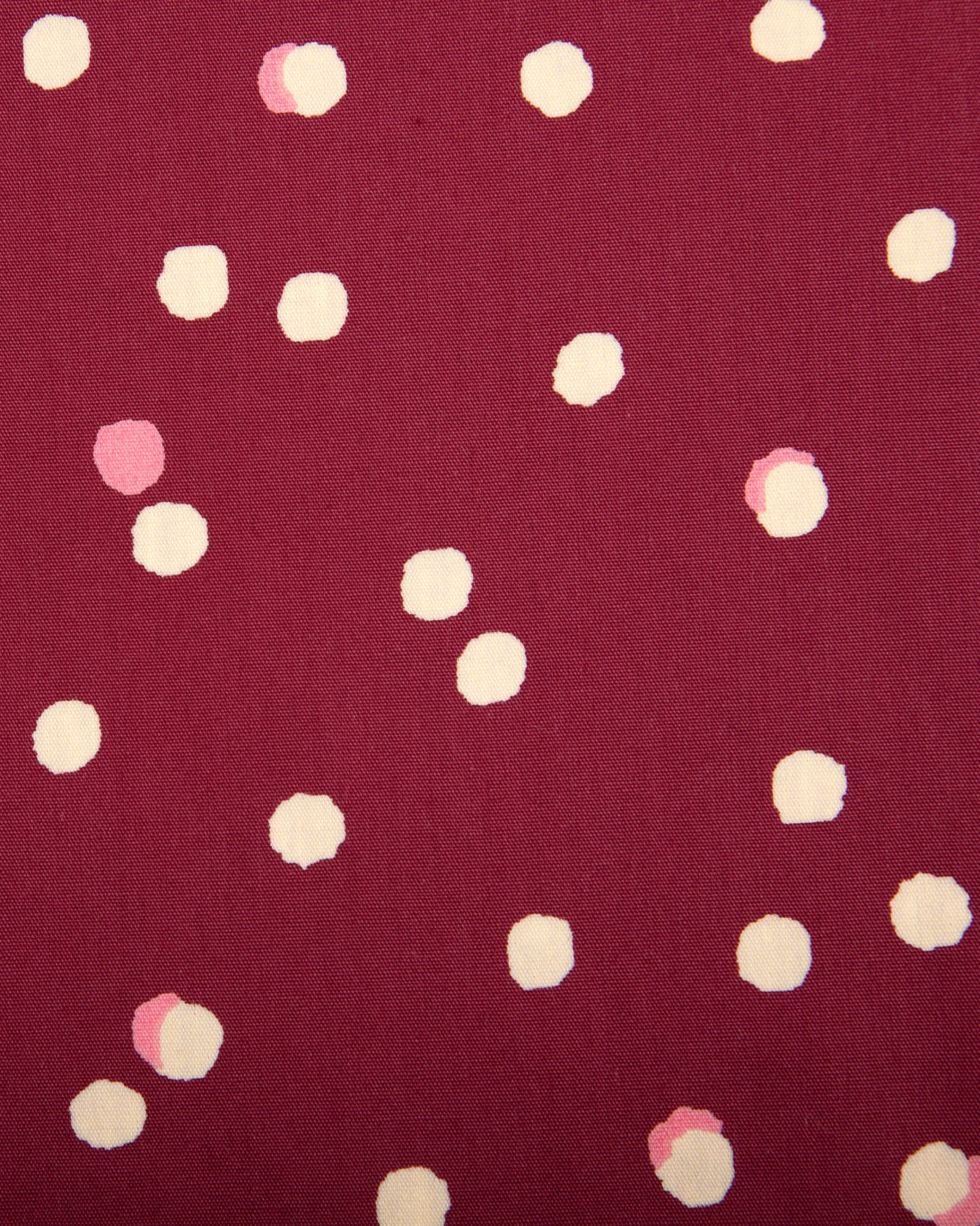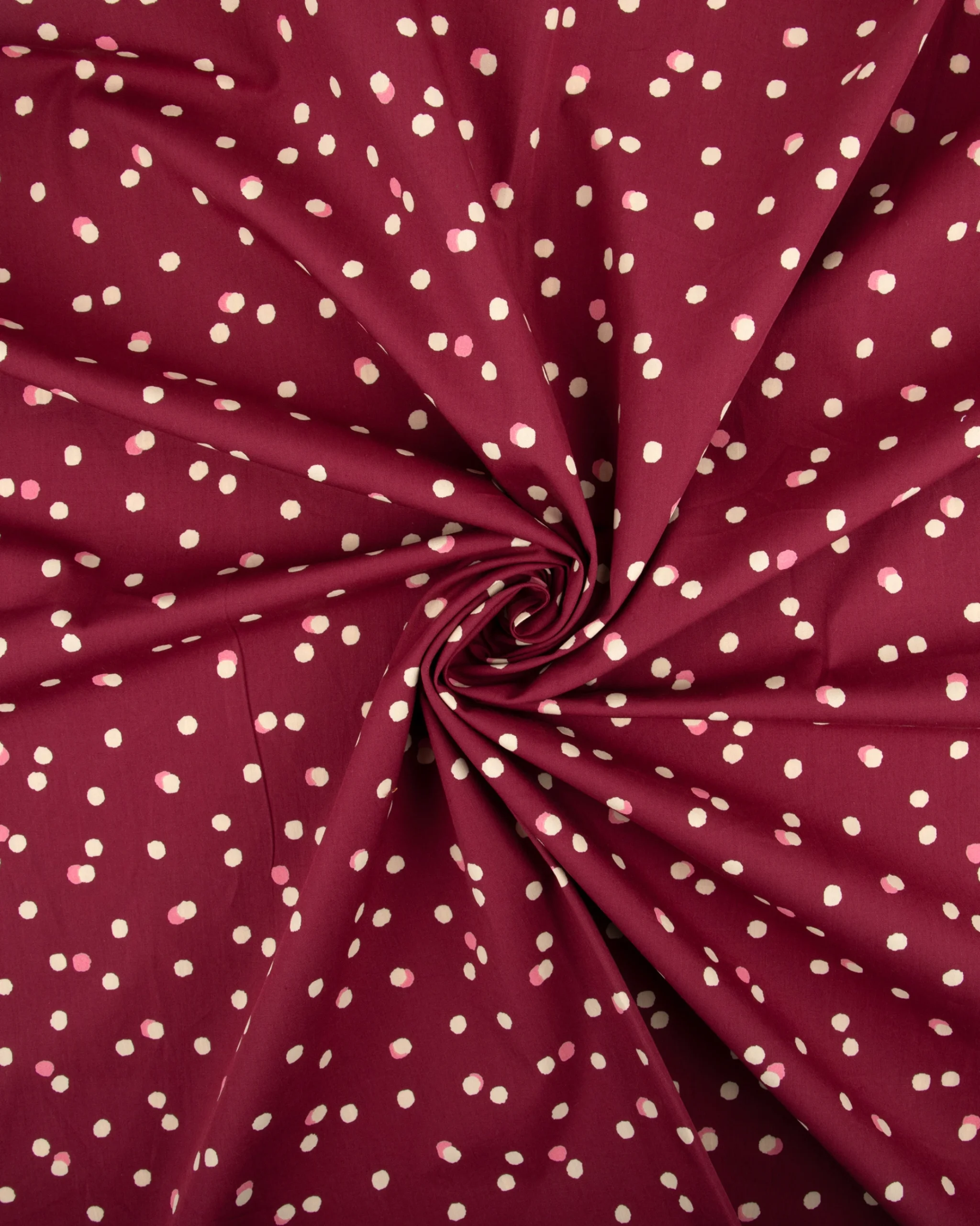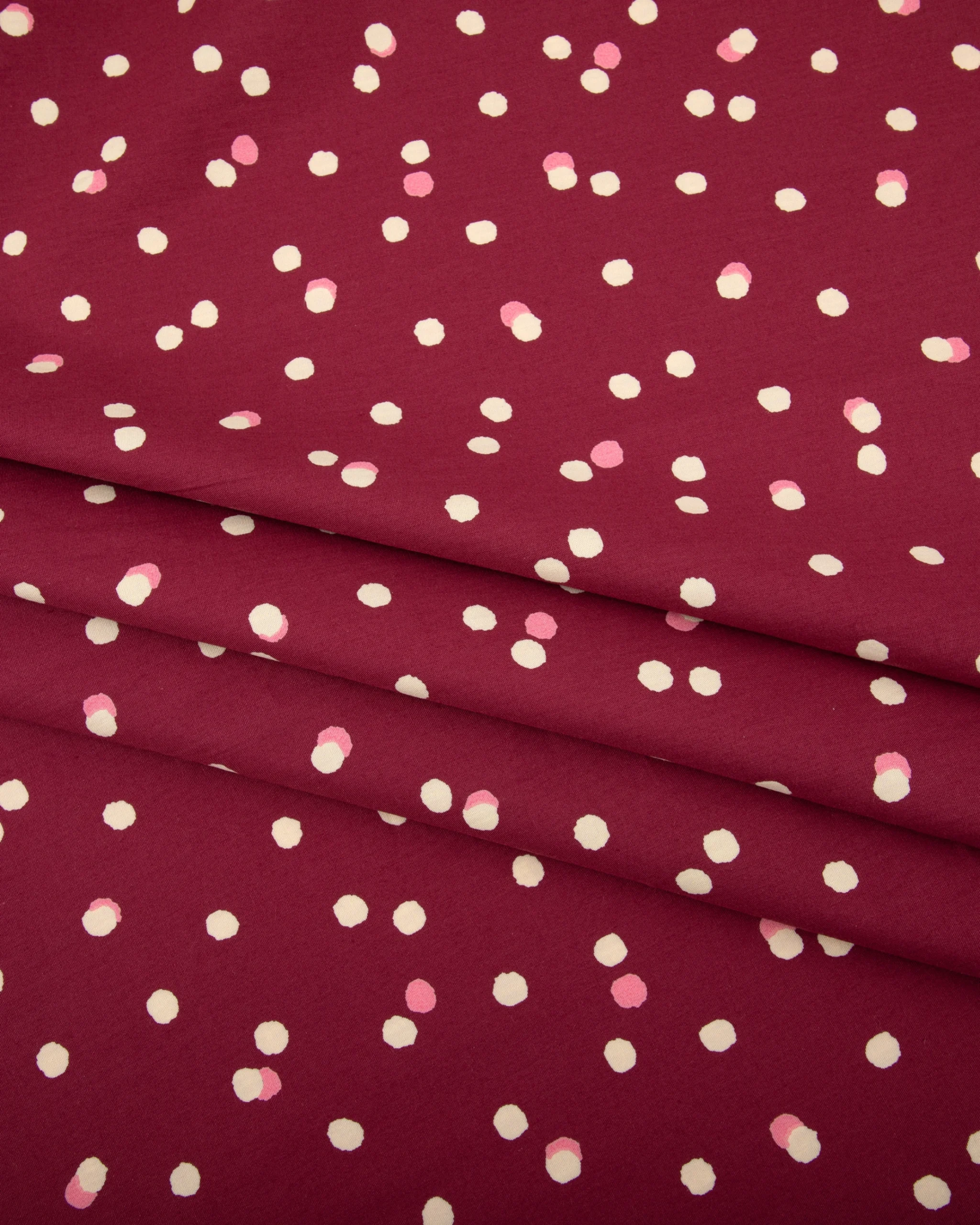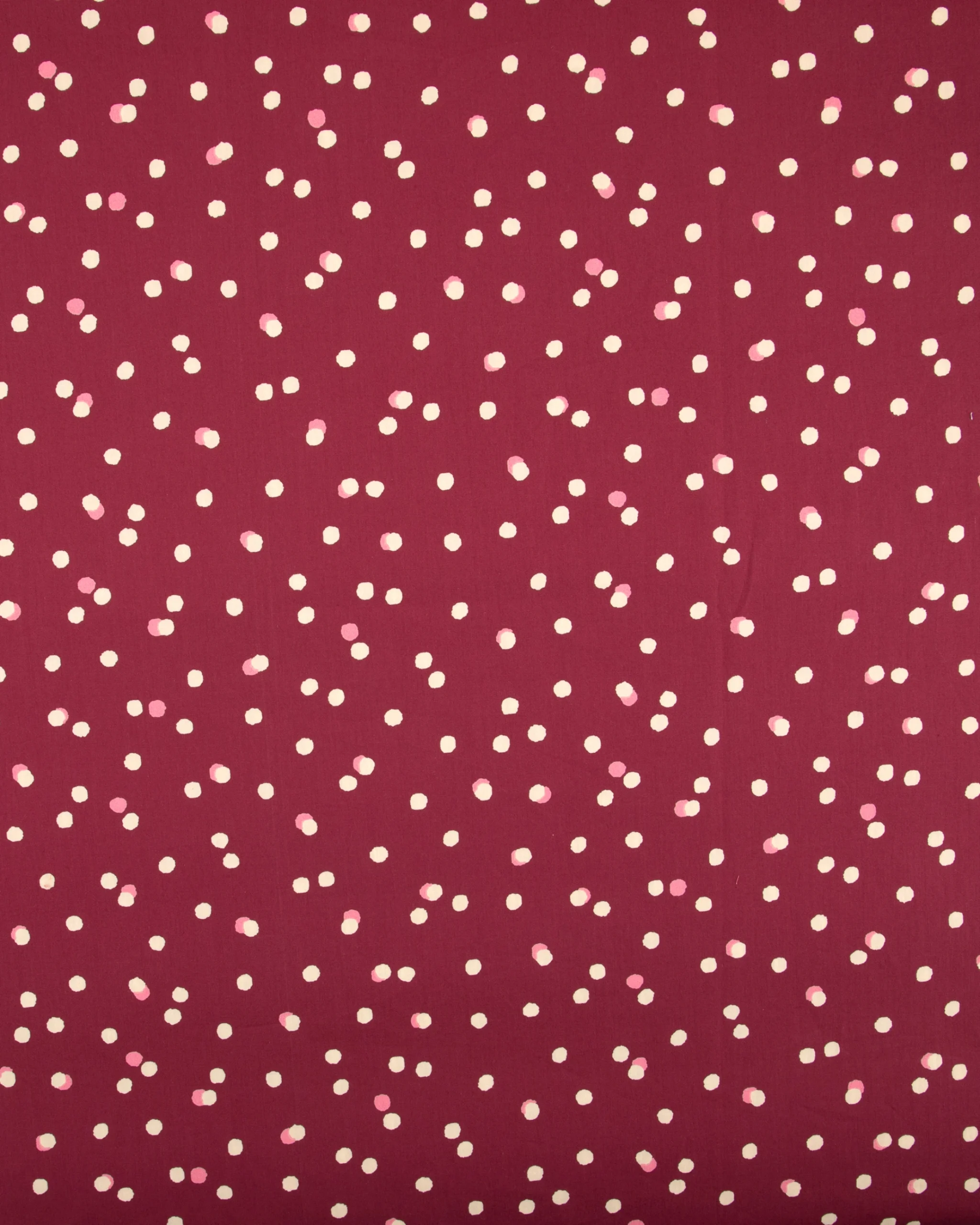 Elevate your wardrobe with this beautiful Printed Viscose Dobby featuring a playful cream + blush polka dot pattern on a rich maroon base.