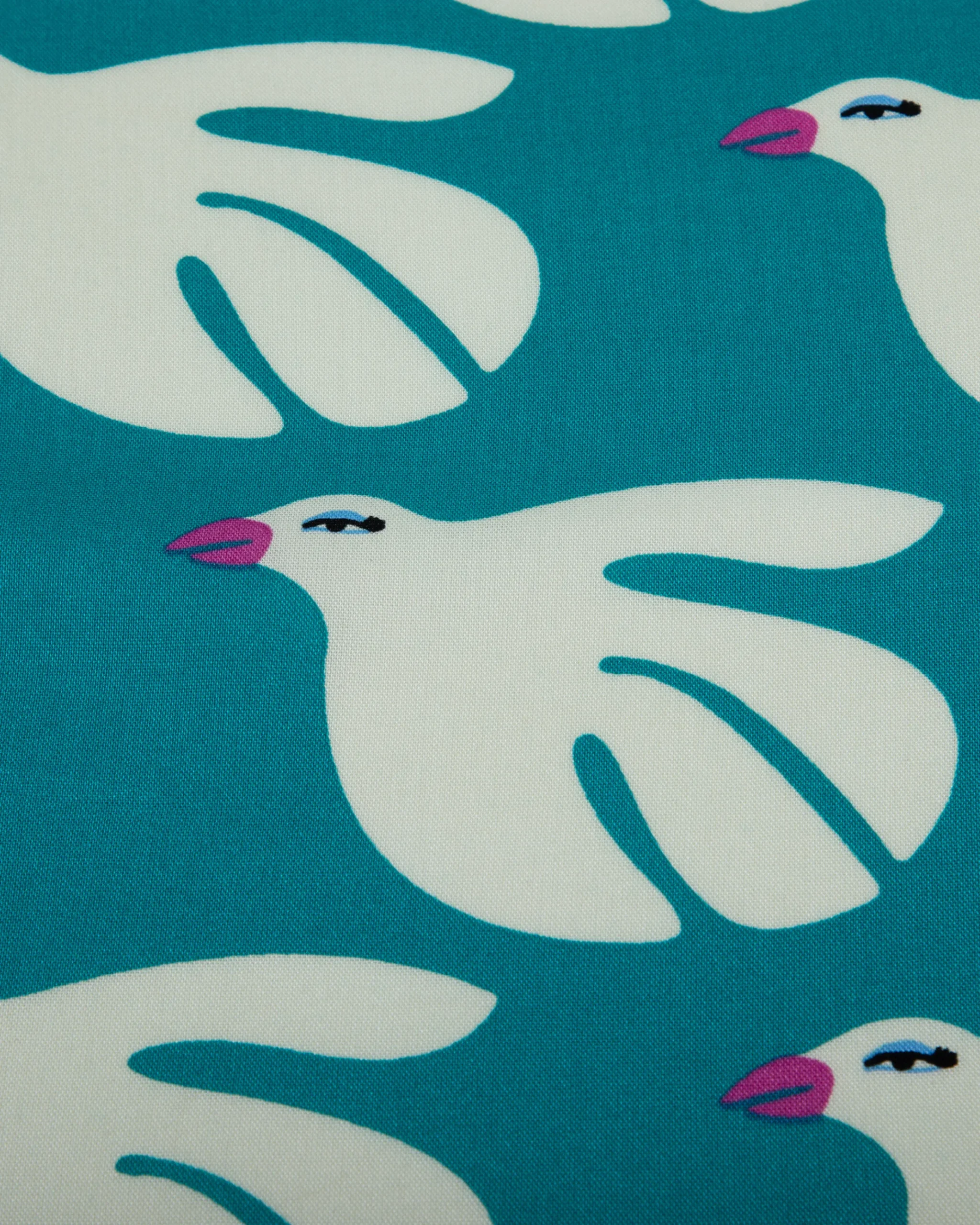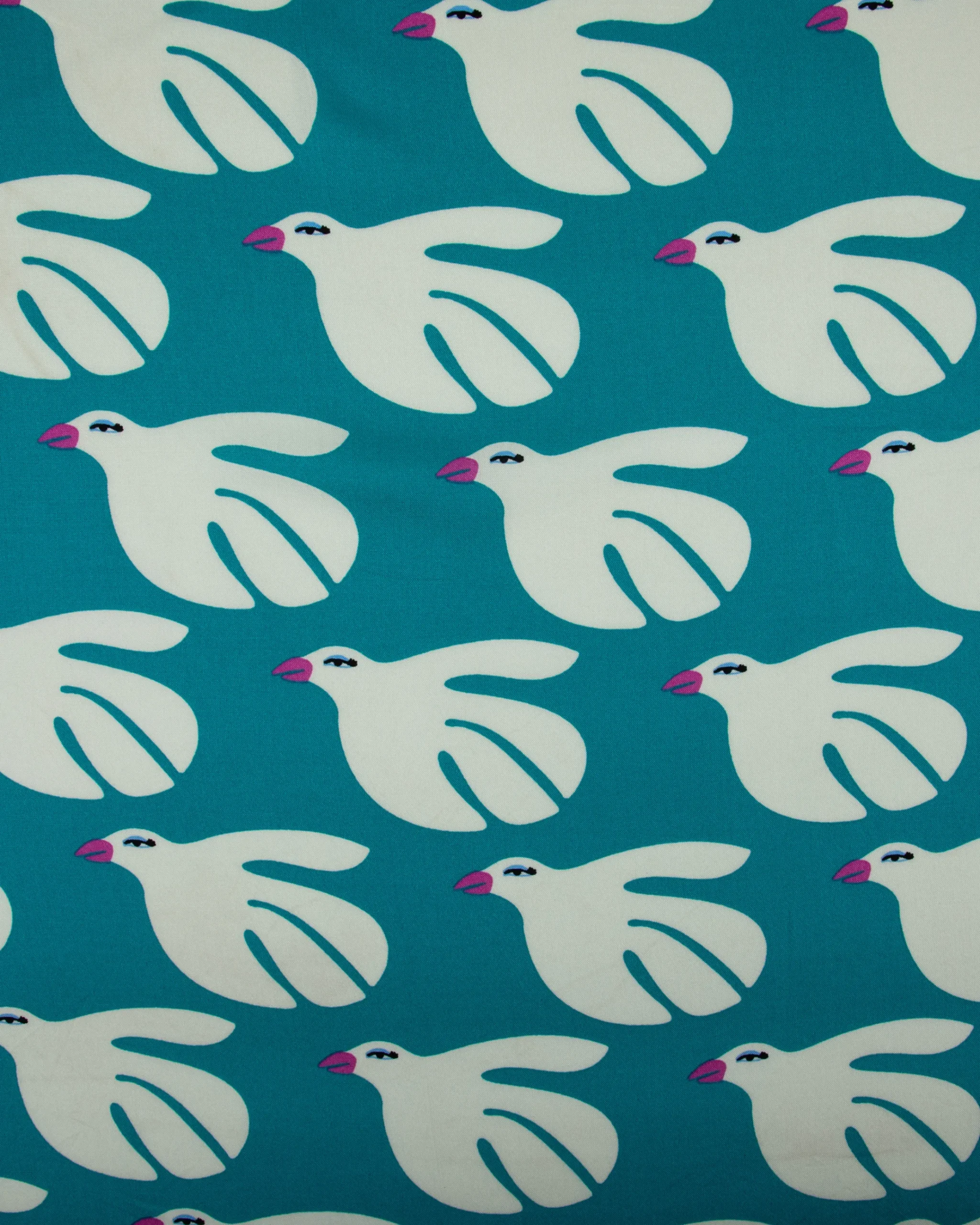 Soft and flowy printed rayon crepe featuring stylized white dove motifs on a rich teal base. Lightweight, breathable, and perfect for statement dresses and modern silhouettes.