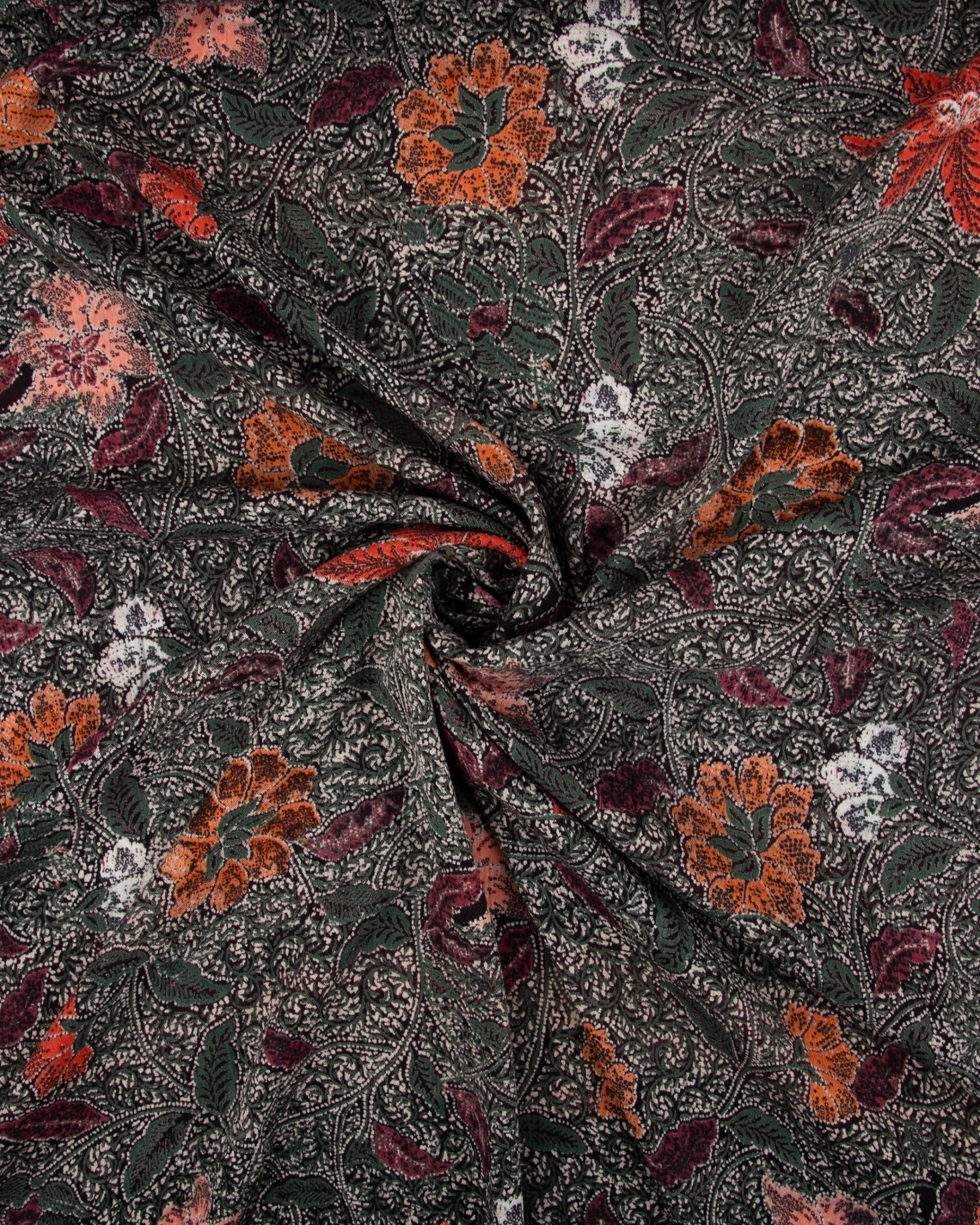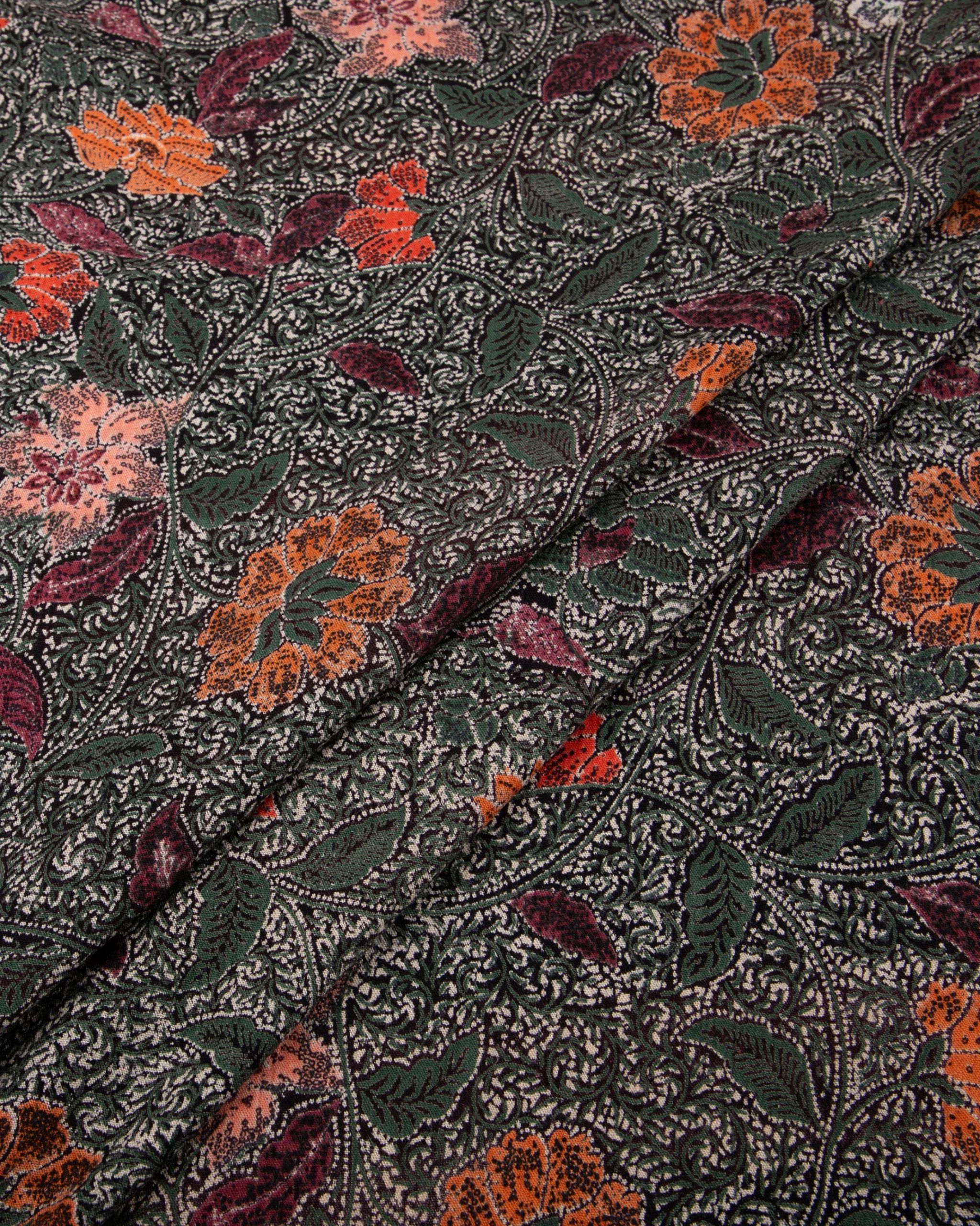 This stunning printed rayon crepe fabric features a richly detailed vintage-inspired floral design set against a deep charcoal background. Large burnt orange blossoms, soft peach florals, and muted maroon accents are beautifully intertwined with olive green leaves and intricate vine motifs, creating a dense botanical pattern with timeless character. The earthy yet vibrant color combination gives the fabric a bold, artistic presence while maintaining a classic bohemian charm.