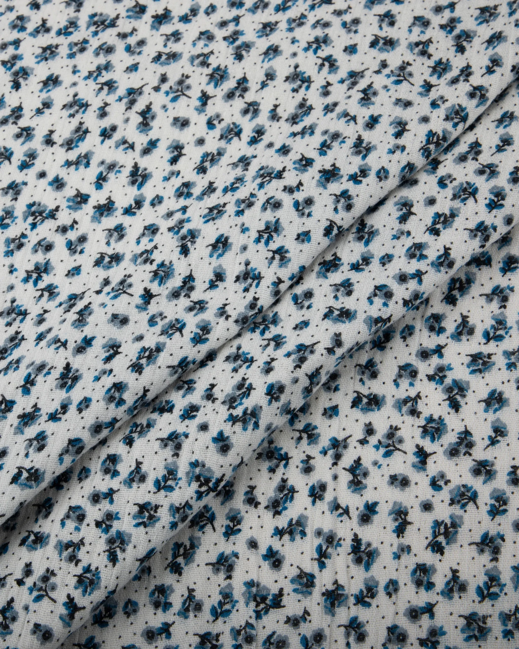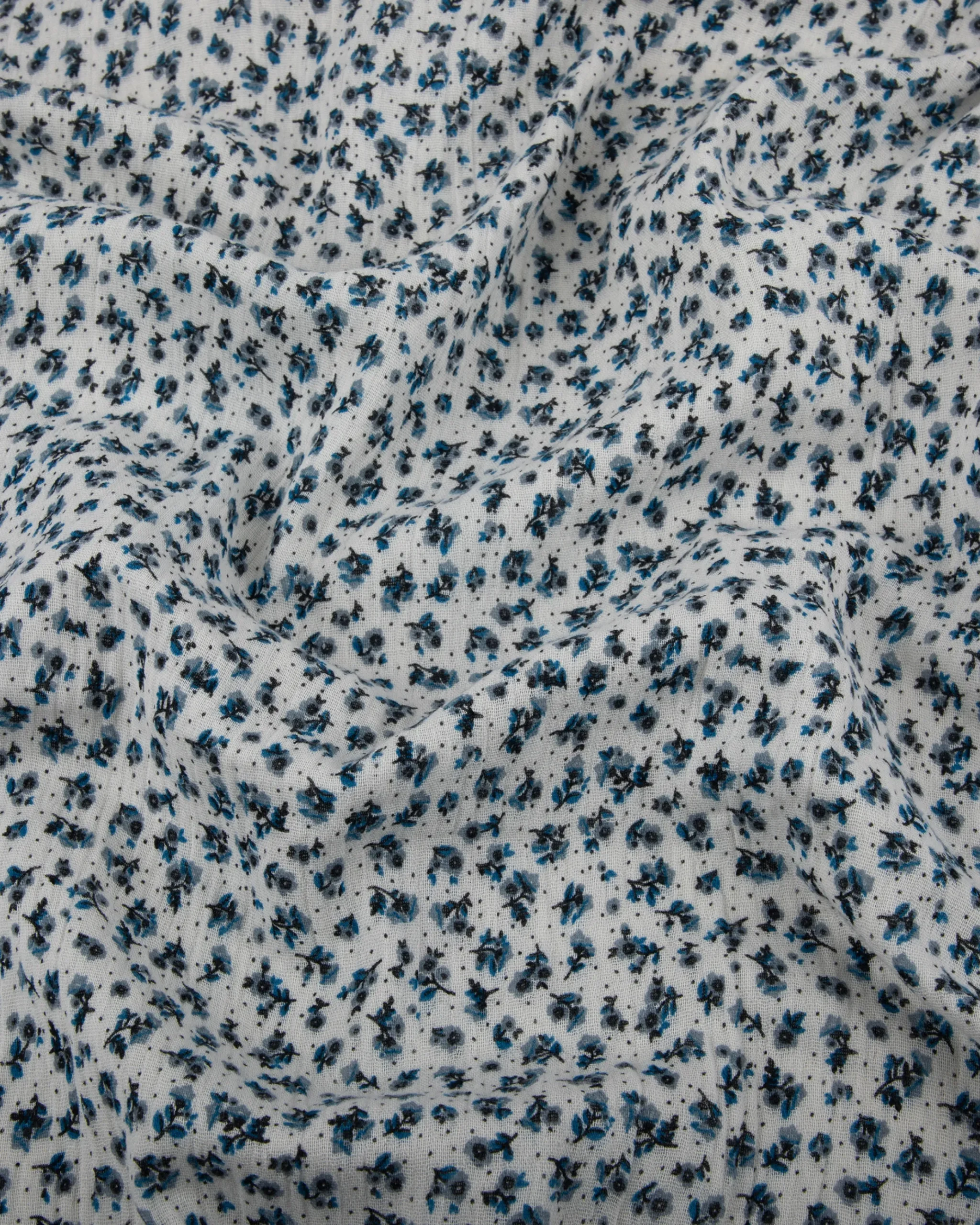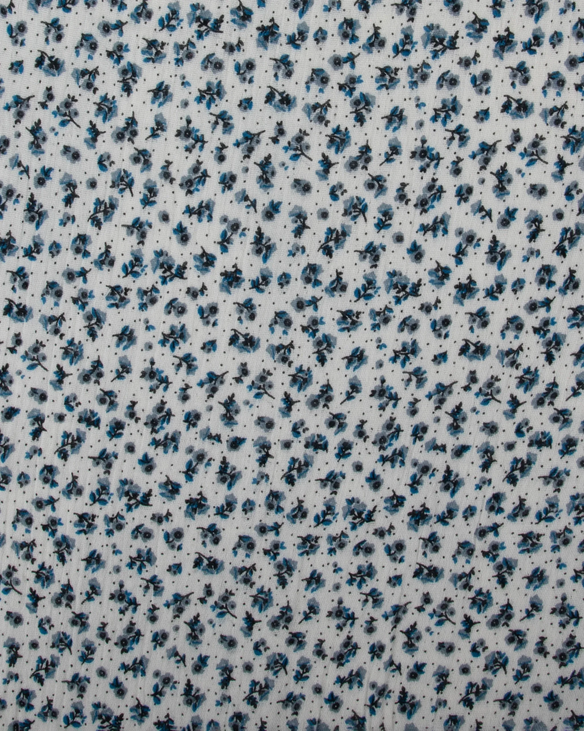 Soft and breathable printed rayon crepe featuring tiny blue and black ditsy florals scattered over a white base. Lightweight with a fluid drape – perfect for dresses, blouses, and everyday wear.
